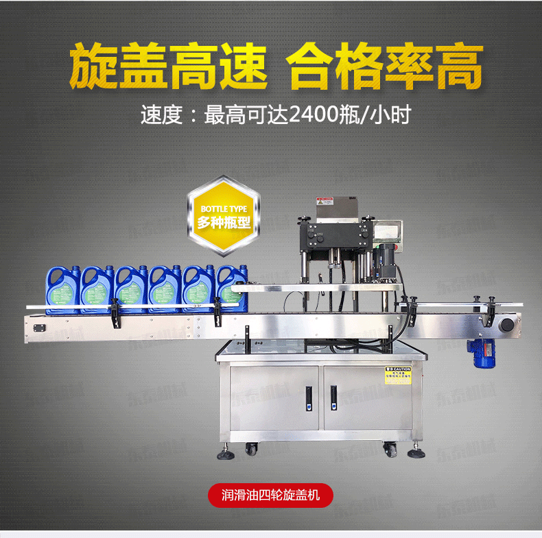 機油自動搓蓋機電氣控制運動,穩定性強; 設有定位裝置,旋蓋標準,操作方便; 鎖蓋范圍寬,可鎖不同形狀規格的瓶蓋;解決了噴頭、泵頭、噴霧泵、手扣式噴頭旋蓋難的