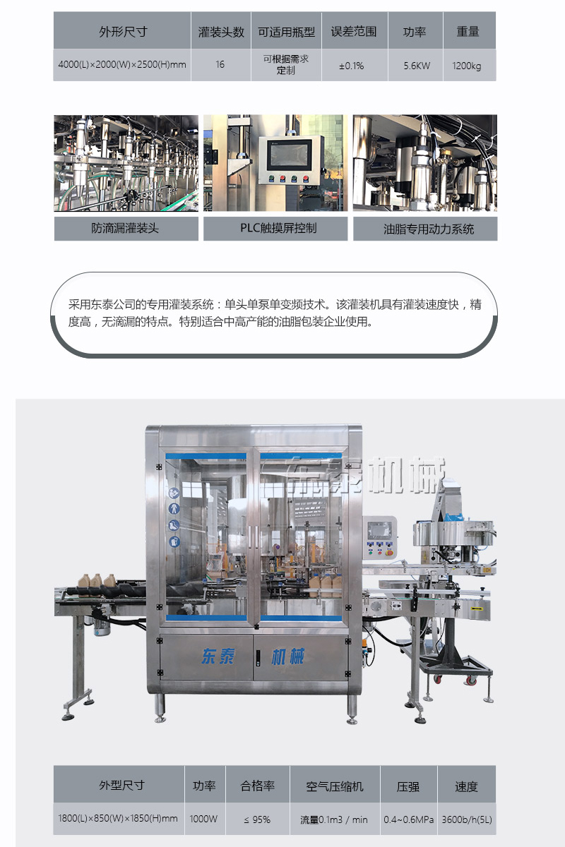 2.采用下潛式灌裝,在桶口以內約5-8mm處進行灌裝,下料口設計,避免了灌裝速度快產生細小油珠噴濺污染瓶