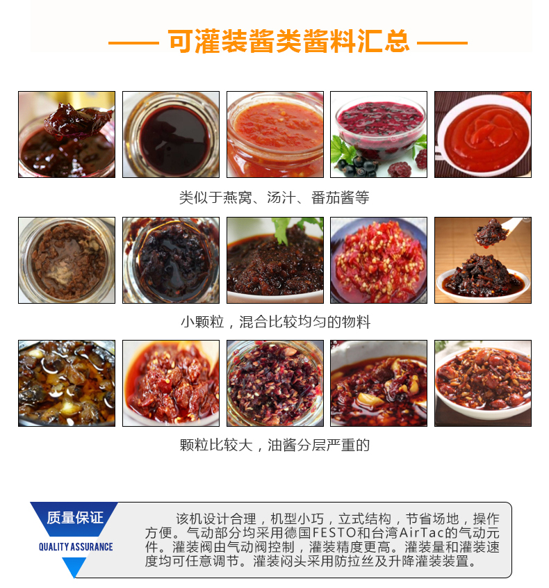 身為公司新生產制造的灌裝機在行業市場上發揮了重要的作用,是集光,機,電,氣于一體,選用活塞式定量原理,灌裝精確度高,使用比較簡單,維護非常方便,設備主要材質:辣椒醬灌裝機選用SUS304不銹鋼制造,衛生指標要求.灌裝環節選用亞克力透明板與外部隔離,確保灌裝的衛生要求。灌裝選用壓力式灌裝,無須配裝高位罐,簡易化了組裝工序,提高了灌裝工作效率??善毡槭褂糜谑称贰⑨u料制造業設備的自動化包裝生產制造